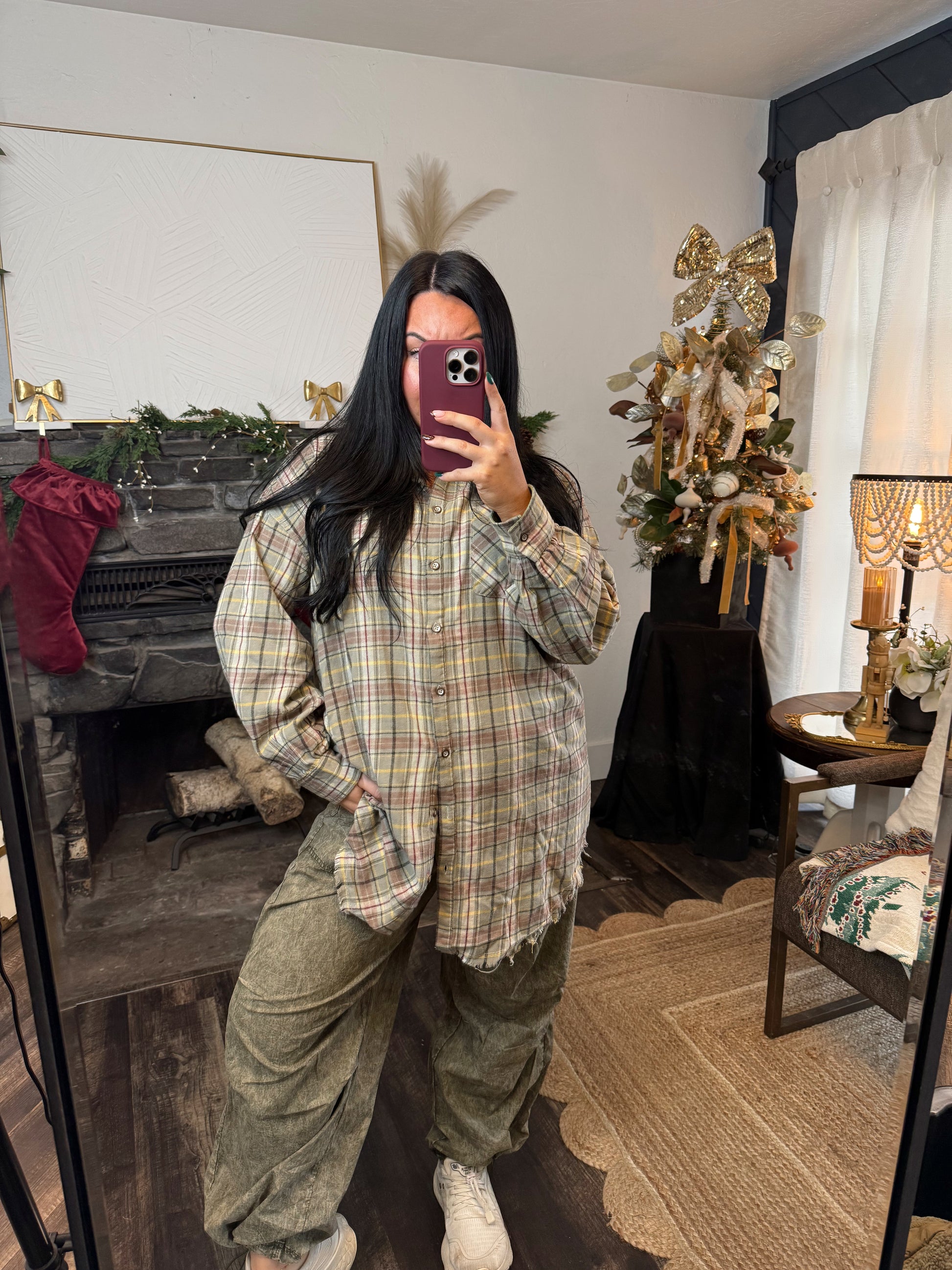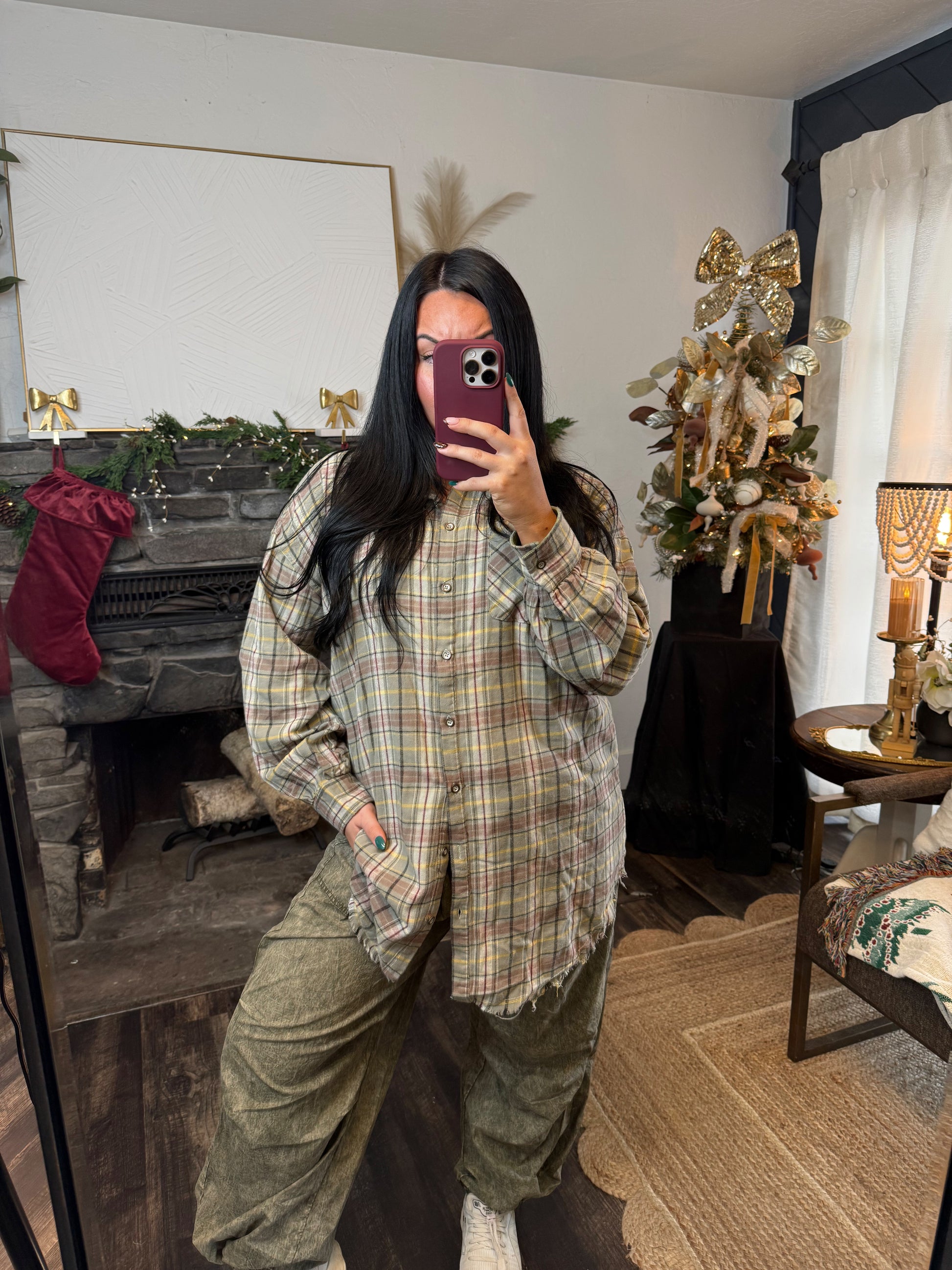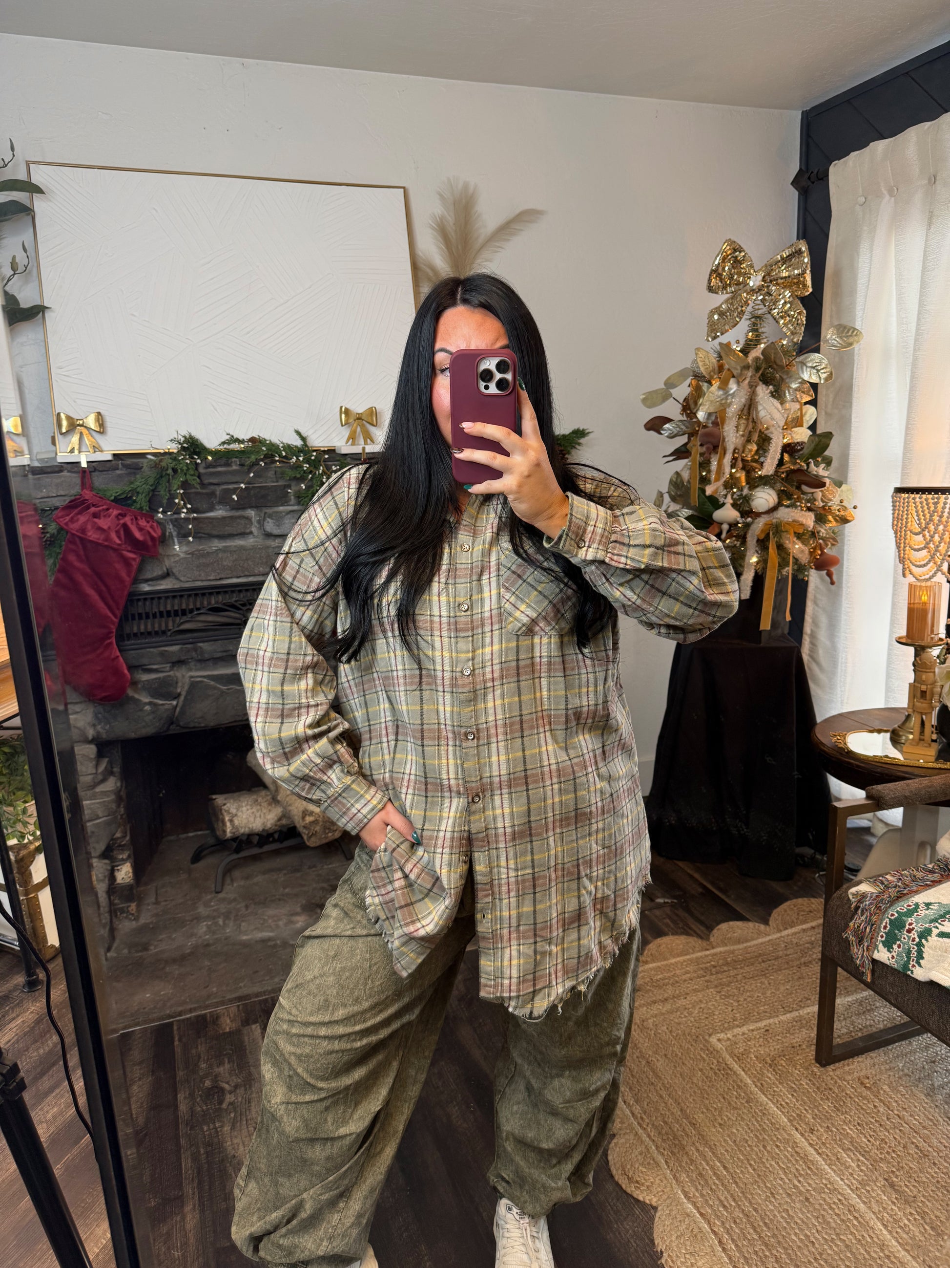 Long line button up flannel. Raw hem detail