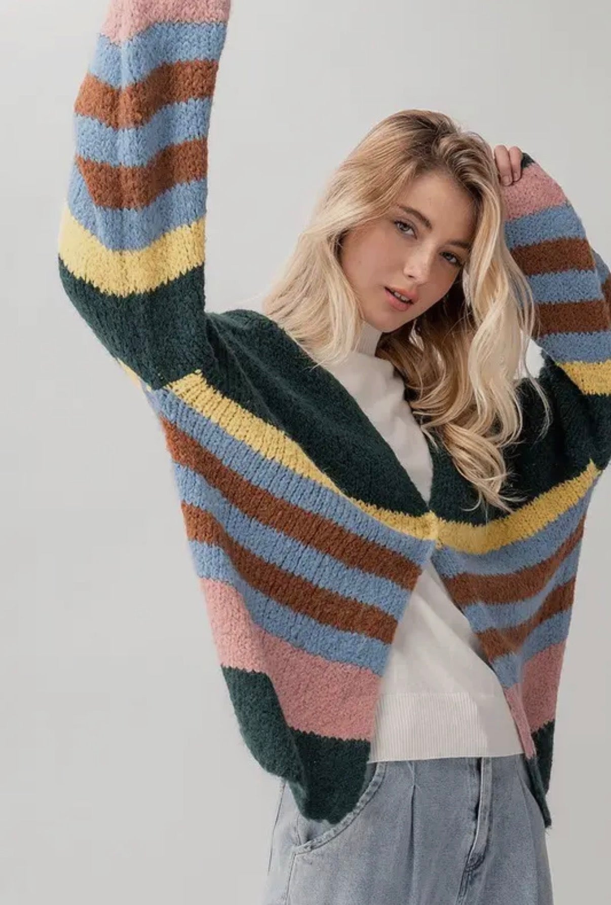 Soft knit striped oversized bishop sleeve cardigan. Perfect as adding a topper over any outfit!
