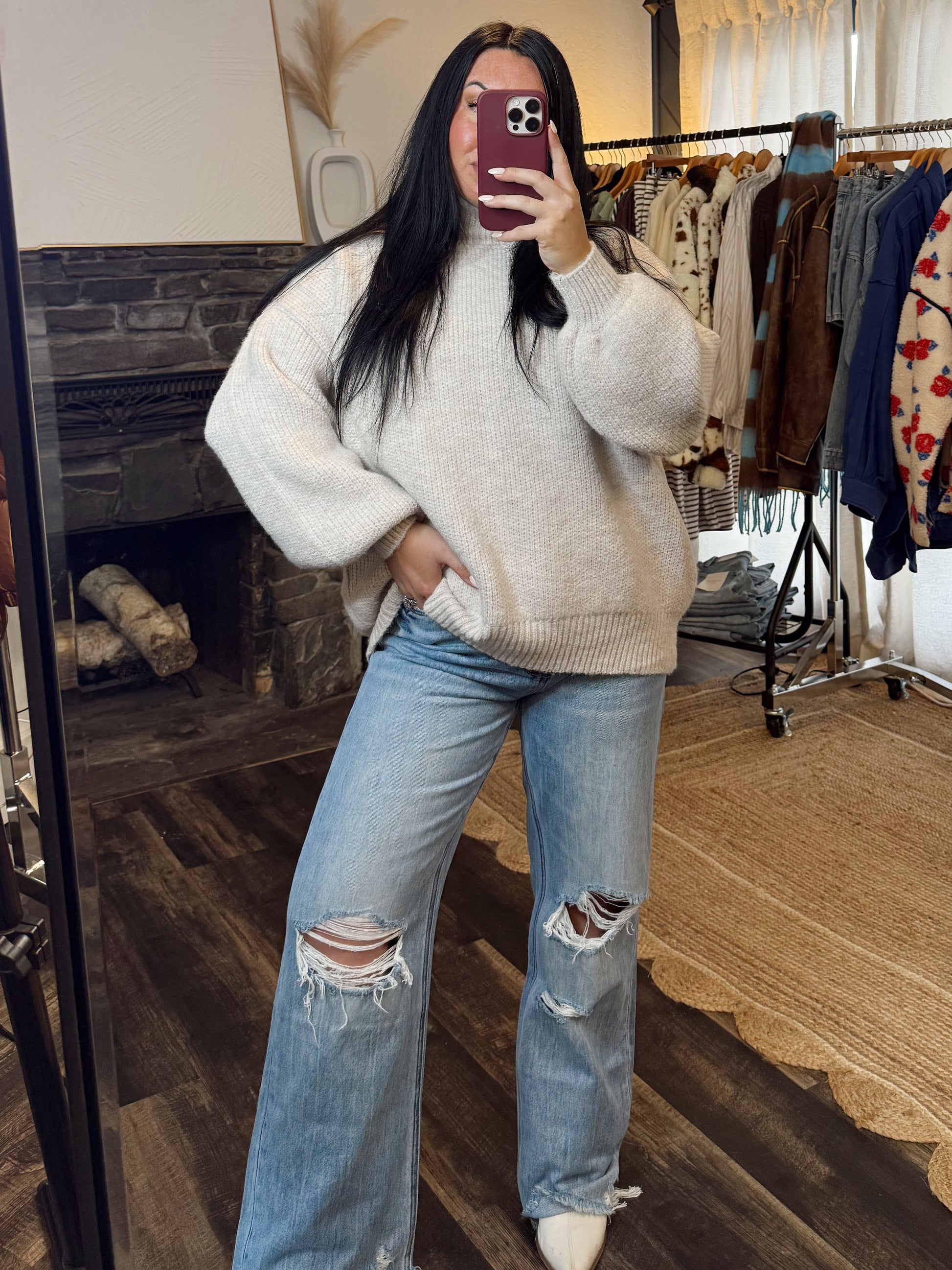 Soft oat color with turtle neck. Thick and soft and great quality. Long puff sleeve with ribbed wrist and waist