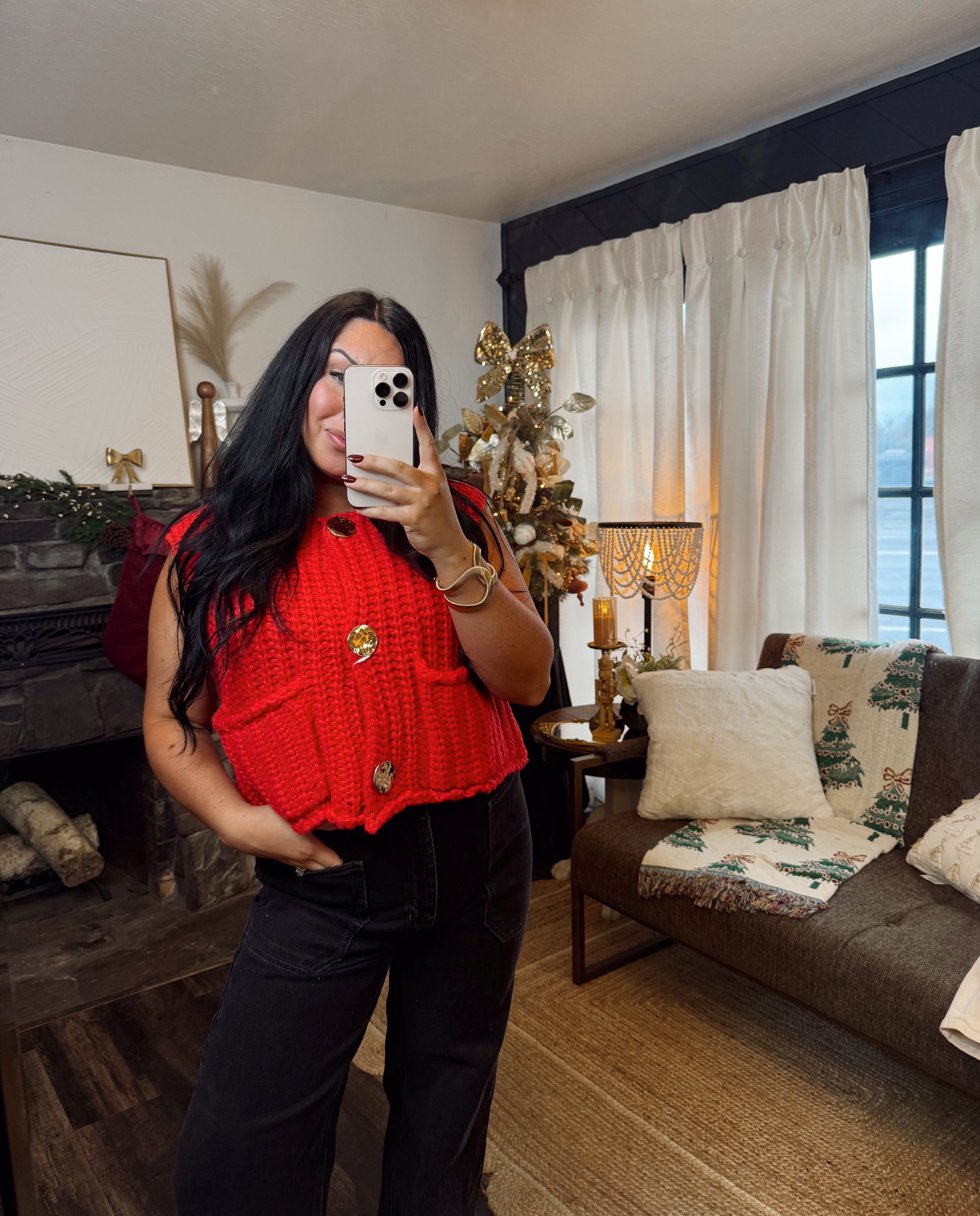 The Button-Front Knitted Vest is a soft vest that redefines comfort and style. Its gold button-front design adds a touch of modern sophistication, while the softness of the sweater material ensures utmost comfort. Perfect for layering over your favorite blouse or chic skirt, this vest is a versatile addition to any woman's wardrobe.
