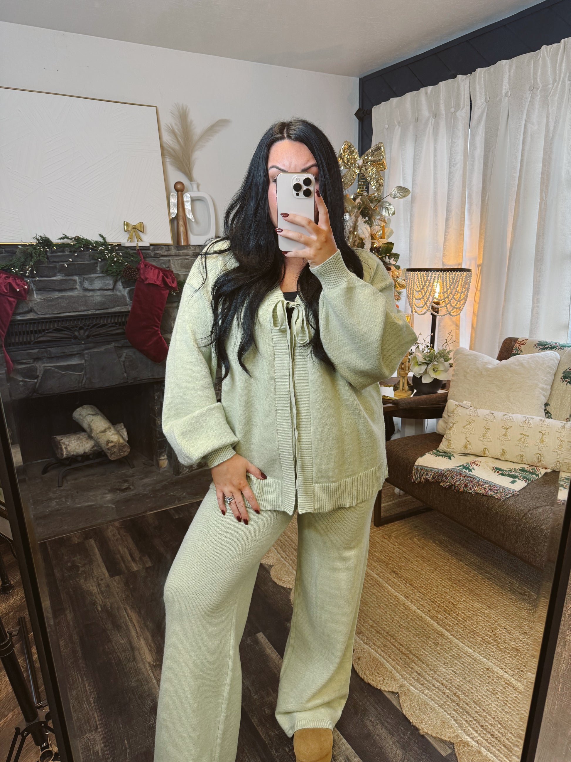 Sage Tie Knit Cardigan and Pants Matching Set