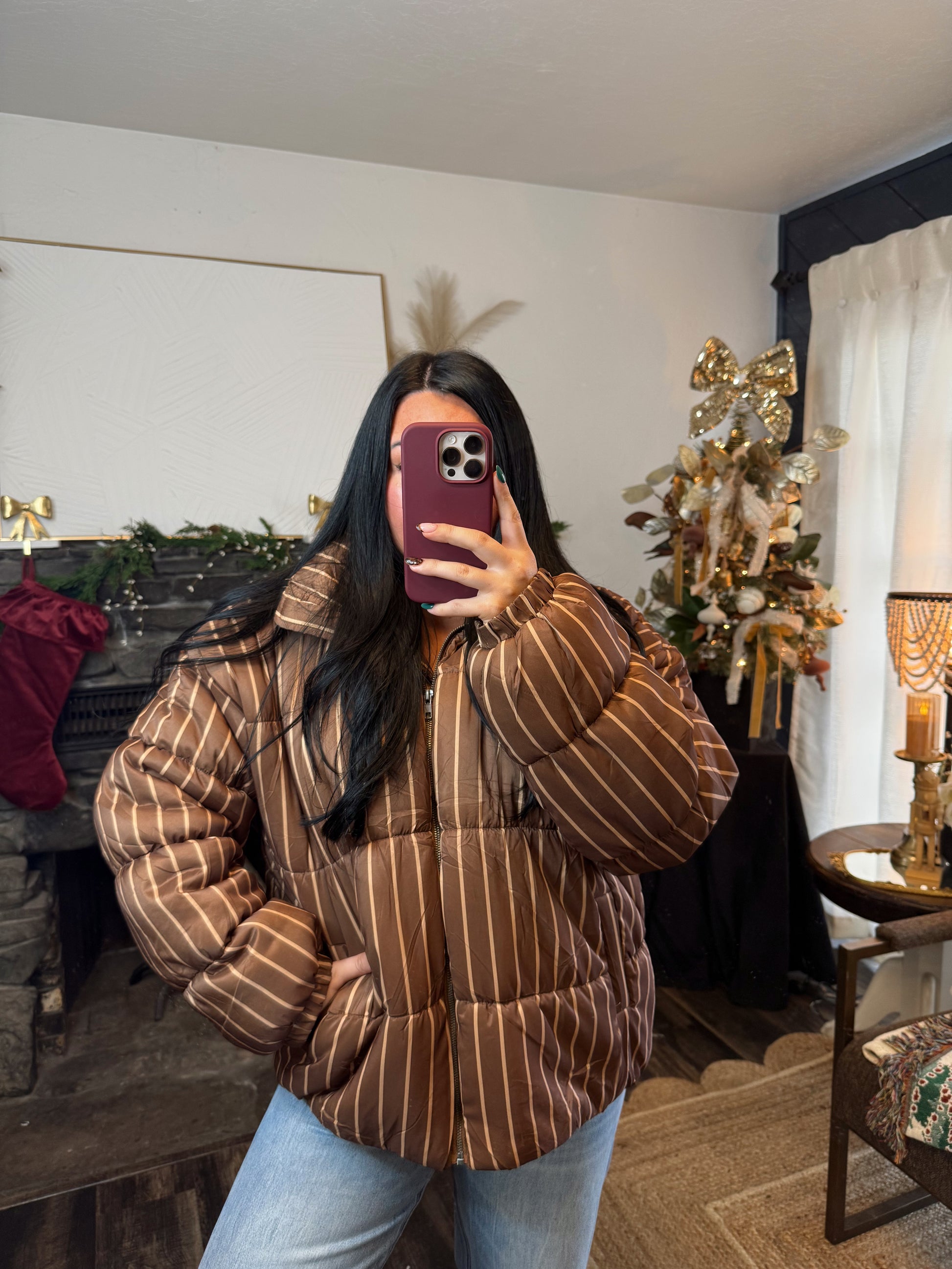 Stay warm and cozy is this beautiful stripe high neck puffer jacket. Perfect neutral tones, front zipper and side pockets. Great to layering in the cold winter months.