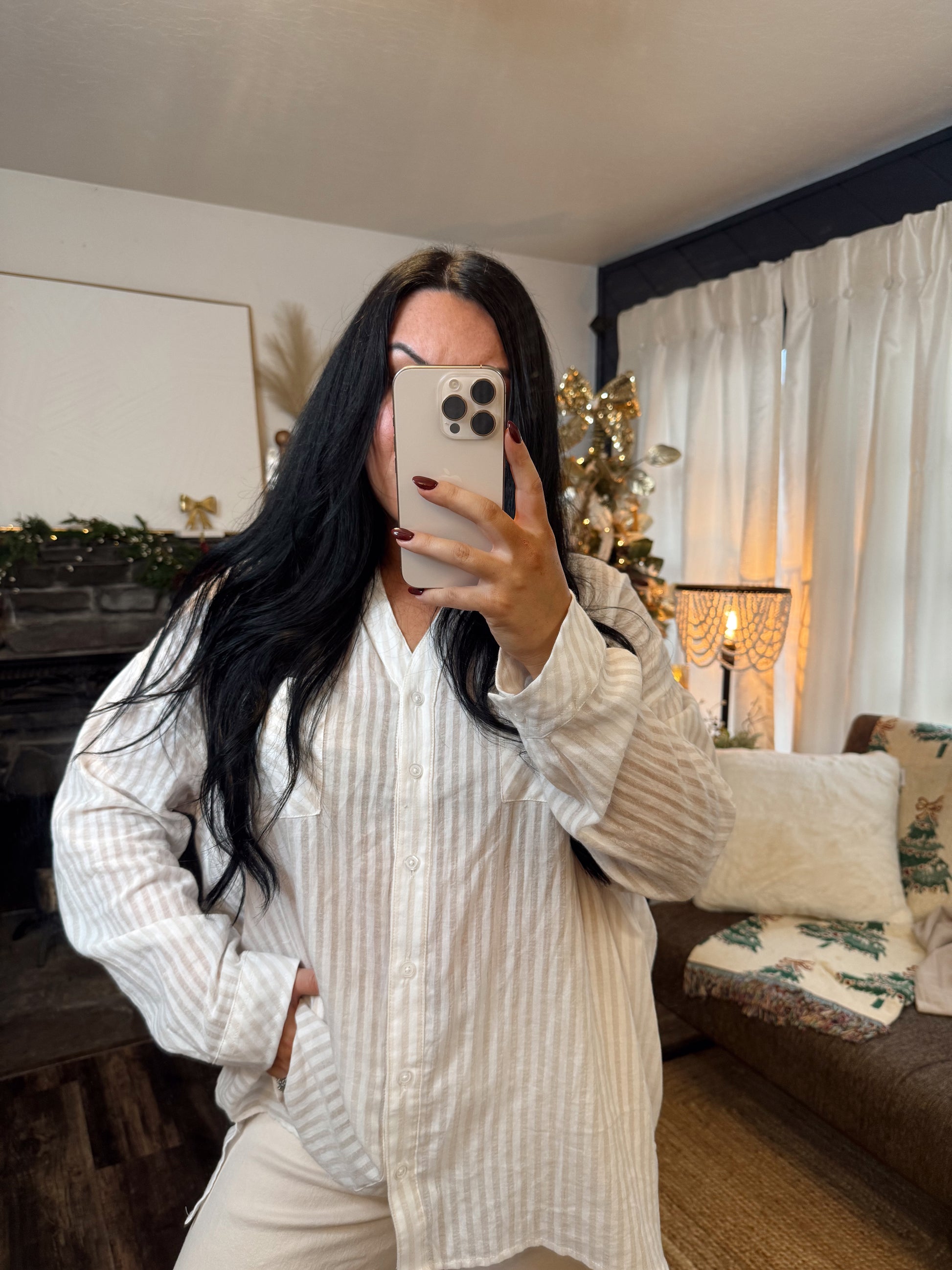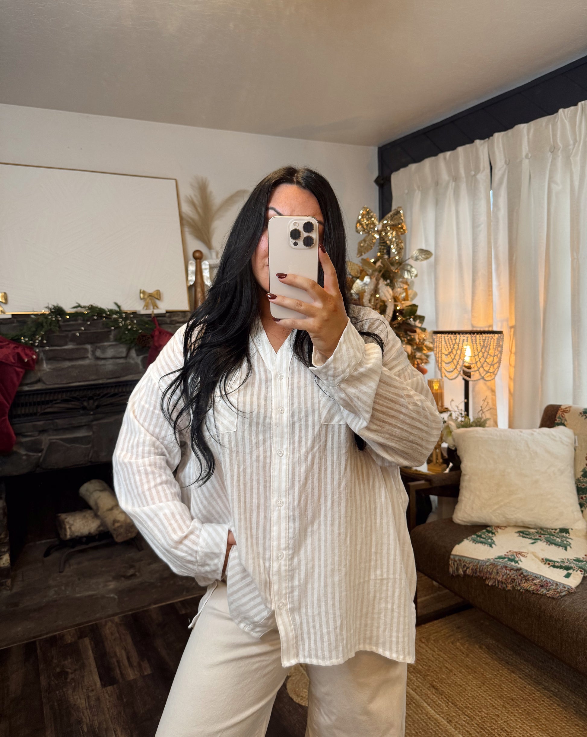 Elevate your outfit with this striped button down top perfect to style many differnt ways.