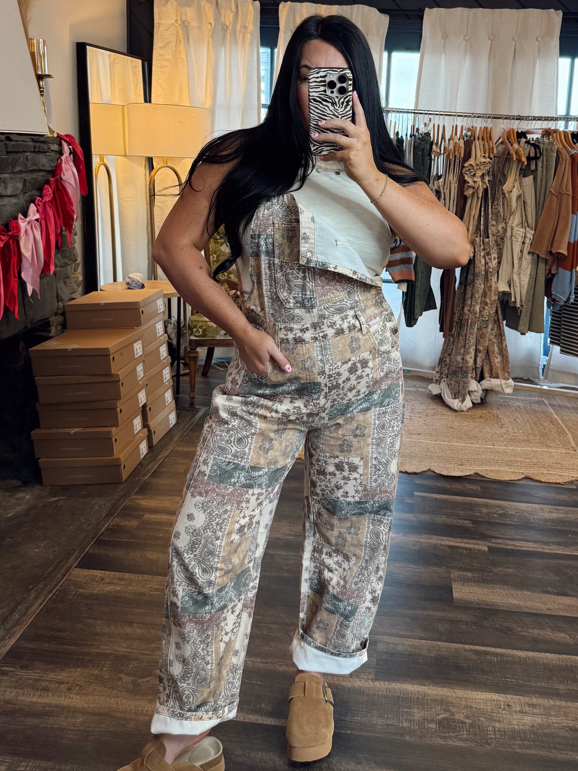 VINTAGE BOHO PRINT - CROSS OPEN BACK - ADJUSTABLE SHOULDER STRAP - BELT LOOP - BARREL LEG FIT - CROPPED LENGTH - REGULAR FIT