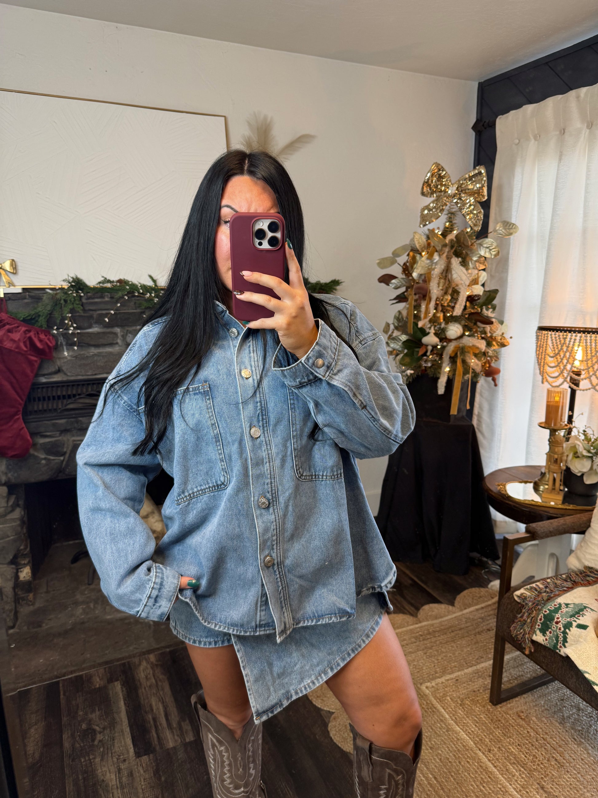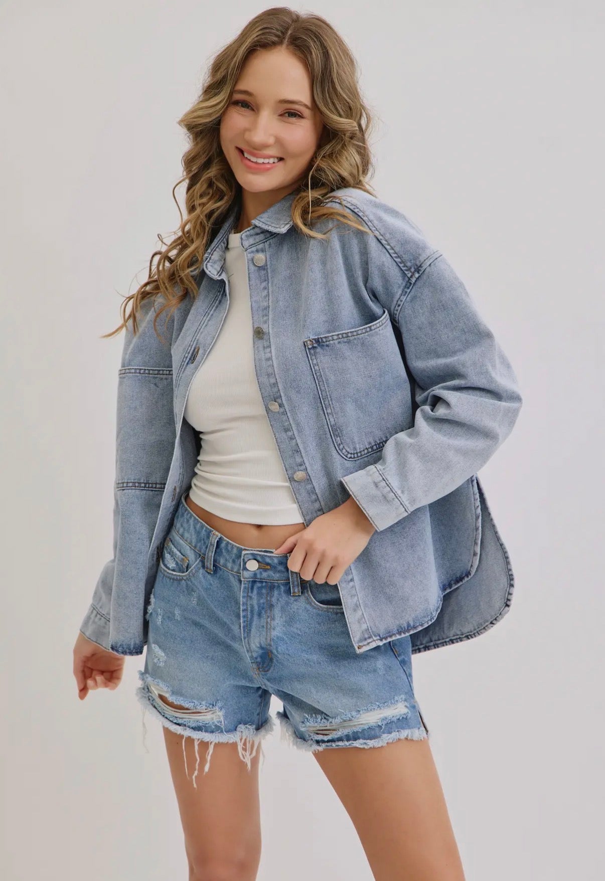 Elevate your casual wardrobe with this effortlessly cool washed denim shirt jacket. Designed with a relaxed, loose fit, this versatile piece features classic button-down styling, large front patch pockets, and dropped shoulders for a laid-back vibe. The light-washed denim adds a vitage-inspired touch, perfect for layering over a tanks, tees, or dresses.