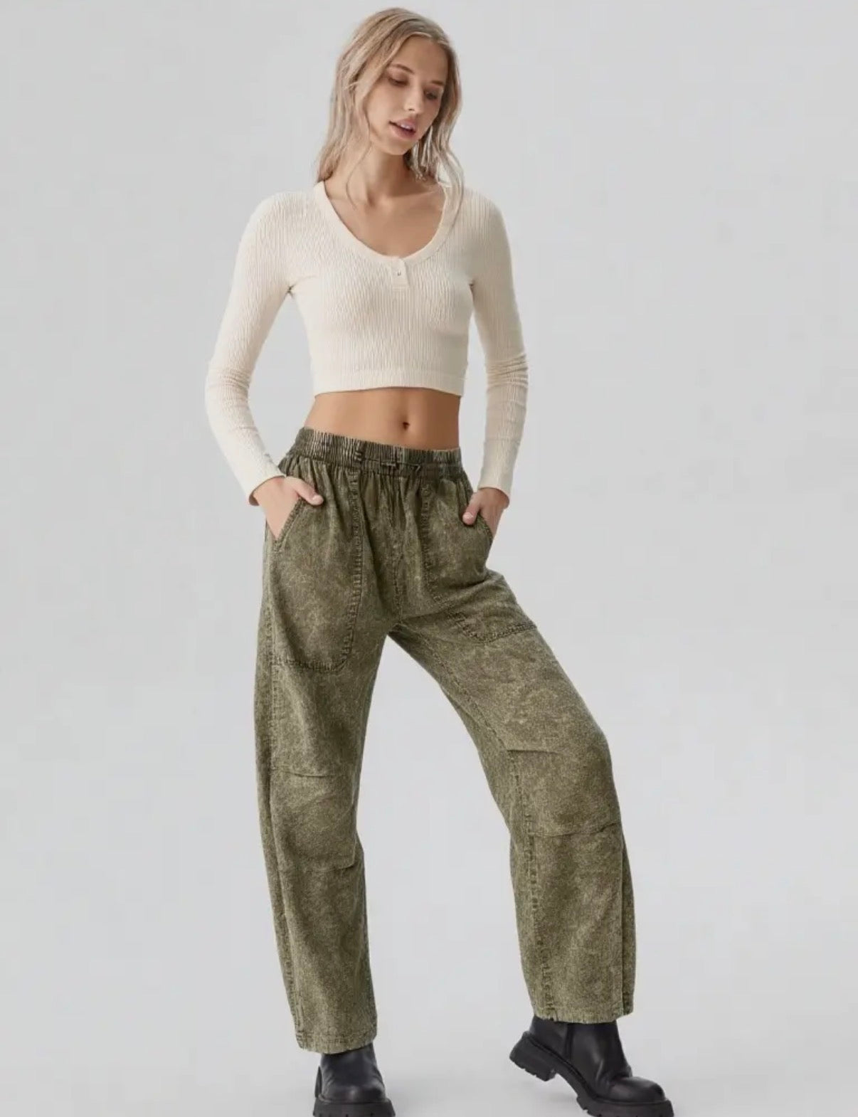 Wash green fit to your need pants! Elastic waist, side pockets and adjustable bottom detail for a wide leg or jogger fit.